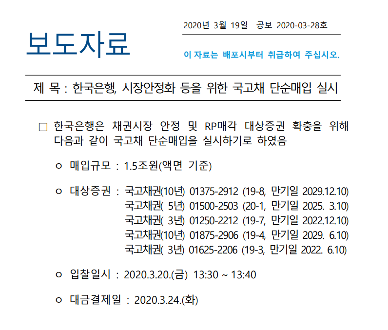 - 금리인하 빅컷과 함께 국고채 매입으로 시장금리를 낮추려는 의도를 발표하였습니다.