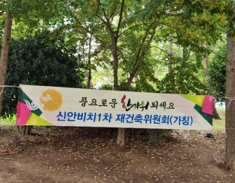 추석전까지는 부동산에서 조용히 재건축 예비안전진단 동의서를 걷고 있었고, 추석 때는 플랜카드를 설치해서 처음으로 인사를 드렸습니다.
