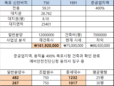 평균 25평으로 재건축 시 총 세대수 1232세대(일반분양 482, 조합원 750)로 재건축 가능하며,