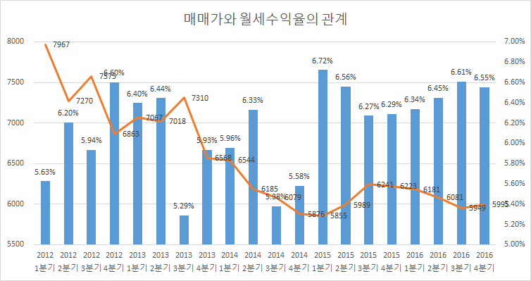 ▶ 2016년 하반기 이후 월세수익율은 6%대를 계속 유지하는 동안 과잉공급으로 매매가는 바닥을 다지는 모습입니다.