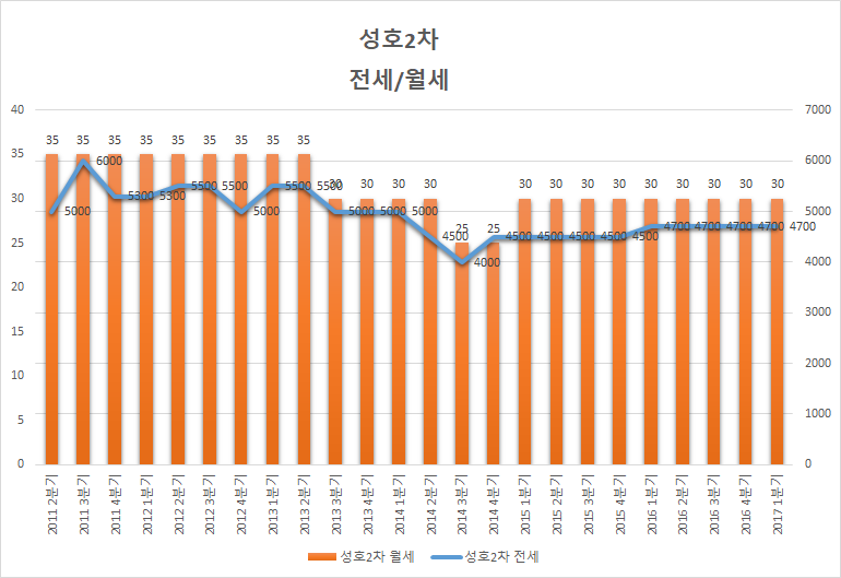 ▶ 성호아파트 전월세는 2013년 한차례 감소하였고, 2014년 철강/조선업 침체로 급격히 감소합니다.