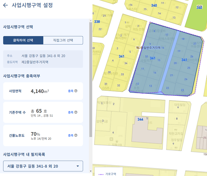 ▶ 사업면적.기존주택 수.노후도.동의율 만족하는 블럭을 찾아 투자 진행